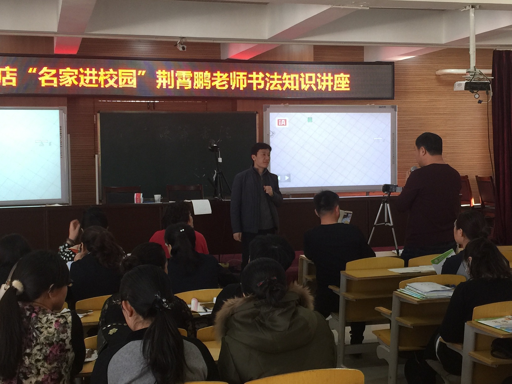 上午活動地點:內蒙古赤峰市紅山區第17小學。來自第十六小學、第九小學、第十一小學等十所學校的老師和領導約360人參加了活動,現場座無虛席。講課內容圍繞硬筆方面的知識,“如何練好字”,“如何教孩子們寫好字”,荊老師現場親授平時經驗,并輔以書法基本知識來講解。