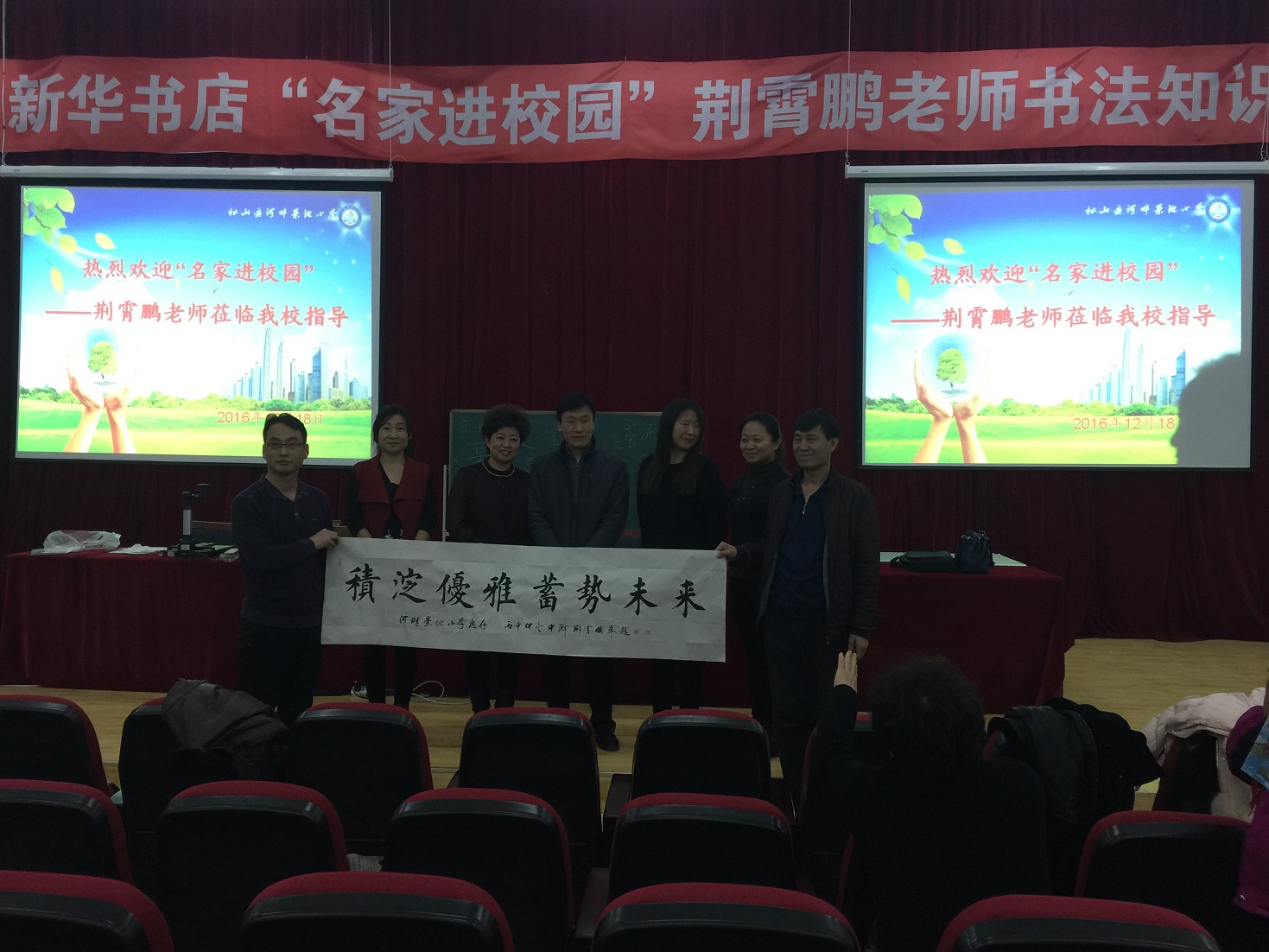 下午活動地點:內蒙古赤峰市松山區河畔景地小學。合計200名家長及學生踴躍報名參加了這次難得的書法盛會。互動環節,學生老師頻頻提問,荊老師都耐心的一一解答,現場氣氛活躍。最后應學校領導的和老師們的要求,荊老師給景地小學留下了“積淀優雅,蓄勢未來”8字的校訓,以勉勵他們學習書法,弘揚傳統中國文化。