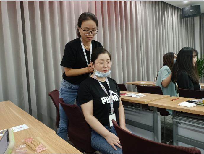 隨后,徐老師引導(dǎo)大家聞香聽(tīng)音,放松身體,輔以芳香按摩,舒緩壓力。