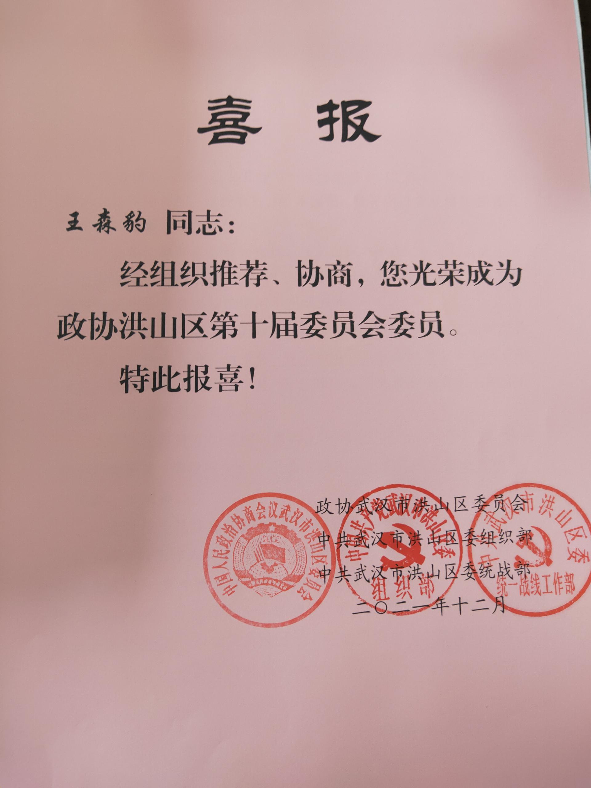 近日,政協(xié)武漢市洪山區(qū)第十屆委員委員會(huì)發(fā)布公告,根據(jù)《政協(xié)章程》關(guān)于政協(xié)委員會(huì)任選的相關(guān)規(guī)定,我司董事長(zhǎng)助理兼電子商務(wù)部經(jīng)理王森豹同志經(jīng)組織推薦、協(xié)商,光榮成為政協(xié)洪山區(qū)第十屆委員會(huì)委員。