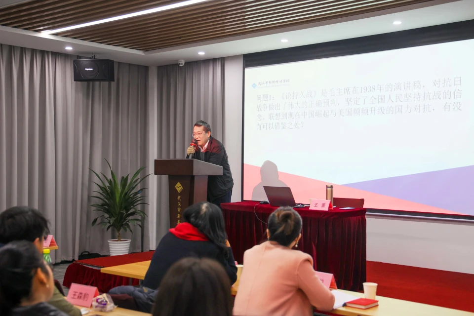 本次月度學(xué)習(xí)會的主題是“《論持久戰(zhàn)》的解讀及對工作的指導(dǎo)意義”。《論持久戰(zhàn)》是《毛澤東著作選編》中,繼《實踐論》《矛盾論》后又一個重要的板塊,集團(tuán)董事長、北京大學(xué)經(jīng)濟(jì)學(xué)院經(jīng)濟(jì)史學(xué)系校外導(dǎo)師王奎英先生,對其進(jìn)行了深入地闡述和解讀。